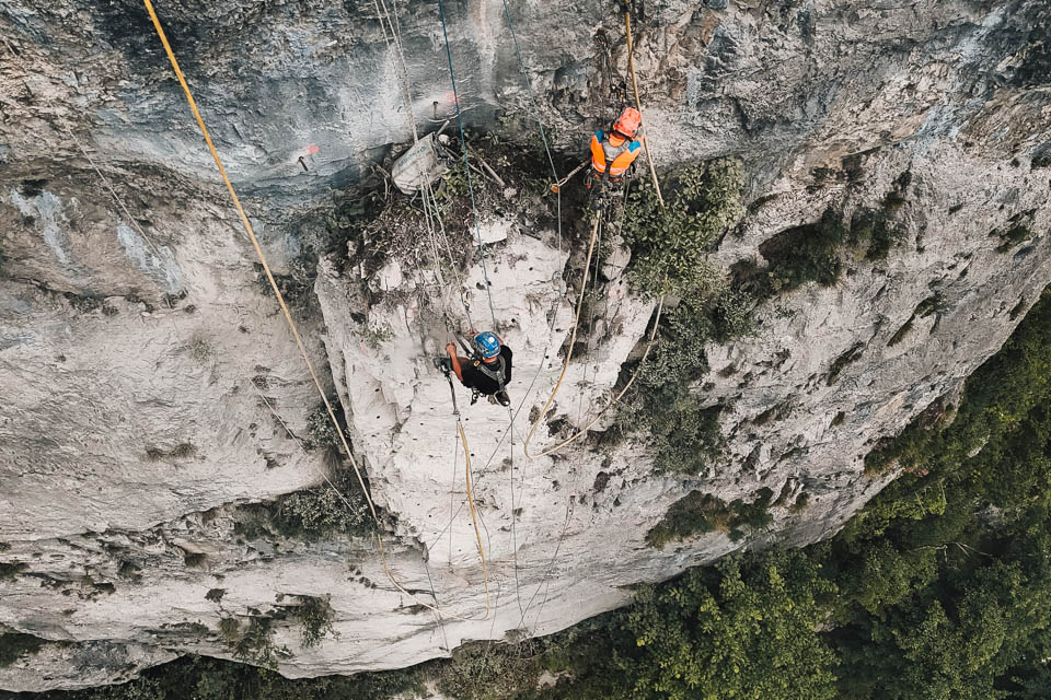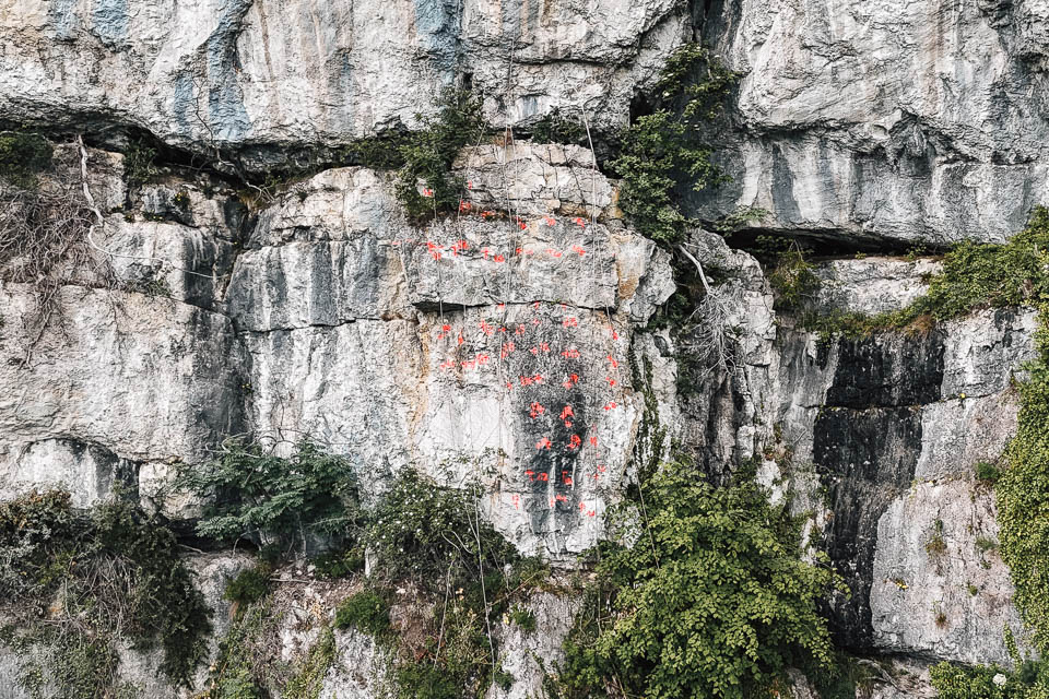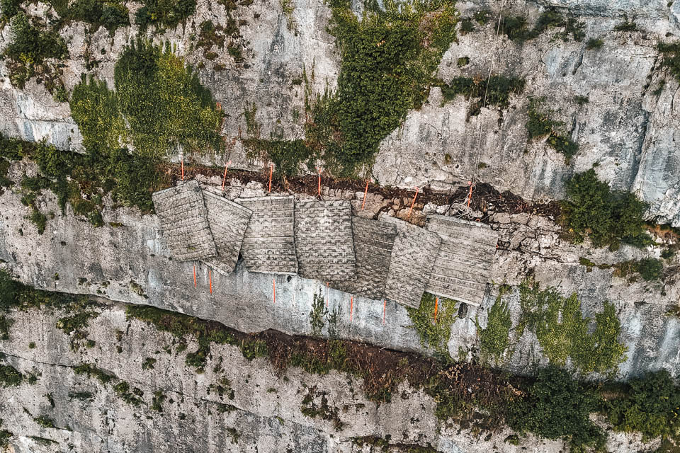 Die gut überwachte Felswand Hinter Wasi, unterhalb von Morschach über der Axenstrasse, gab auch in diesem Frühjahr einzelne Hotspots frei. An acht Stellen durften wir Hand anlegen und Gefahrenpunkte beseitigen. Neben einfachen Felsreinigungsarbeiten, einer Fallbodenausbildung mit Schutzdamm und einer Objektsicherung mit Anker und Drahtseilnetzen standen drei Sprengungen im Fokus. Die drei Objekte befanden sich im oberen Drittel der ca. 60 m hohen Wand, sodass wir permanent gesichert am Seil arbeiteten. Es galt zuerst die aufliegende Schuttablagerung händisch abzutragen und danach die Objekte für die Sprengung vorzubereiten. Dazu wurden mit der Handbohrmaschine die Löcher gebohrt. Da das Zeitfenster am Sprengtag sehr kurz war, brachten wir Ladungen und Objektabdeckungen bereits am Vortag an. Dies hatte zur Folge, dass eine Sprengwache über Nacht vor Ort bleiben musste. Wir nutzten das erste freie Zeitfenster der SBB, sperrten die Axenstrasse und zündeten die drei Objekte.
