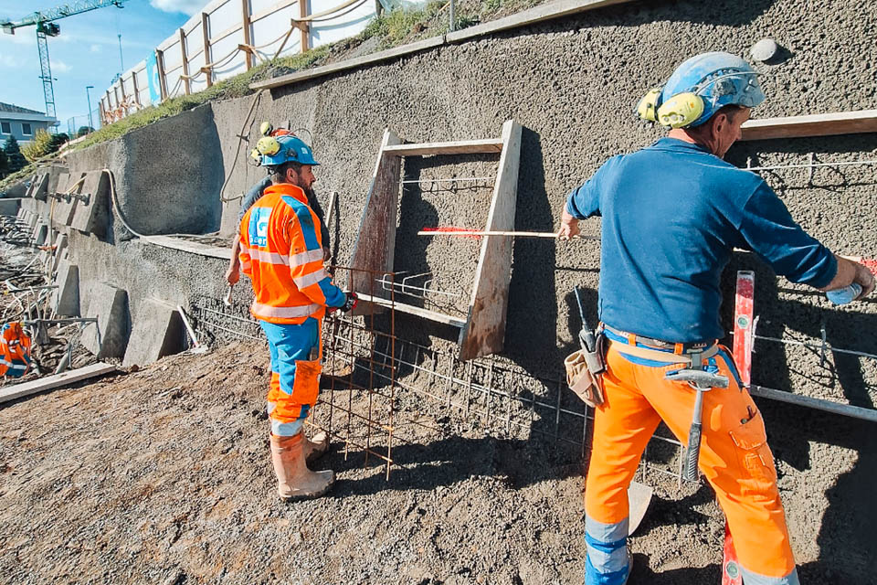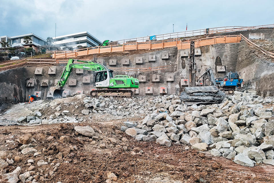 Als Subunternehmer der Firma Christen AG realisieren wir die Baugrube in drei Etappen. Die Geologie des Hangs ist anspruchsvoll, da der Boden eine schwache Zwischenschicht aufweist. Diese wird während des Sicherungsprozesses mit drei Litzenankerlagen stabilisiert.