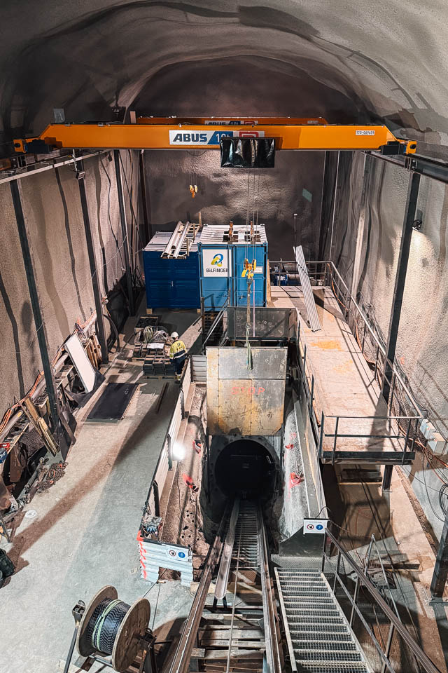 Die untere Steilstrecke führt von der Kaverne über 250 m rund 160 Höhenmeter hinunter zum Fusskrümmer. Bilfinger bringt die 10.5 m langen Rohre mit einer Seilwindenanlage ein. Nach dem Verschweissen der Rohrstücke verfüllen wir den Ringraum über eine Betonierrinne, die von der Kaverne bis nach unten führt.